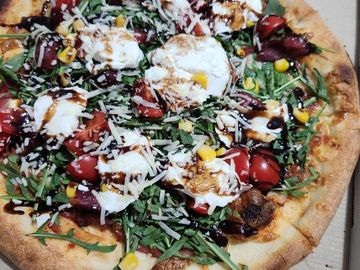 This was not what I expected. It was a red base, with arugula, tomatoes, red onions, corn, fresh mozerella, shredded cheese, balsamic vinegar