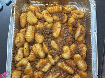 Potato gnocci in a meat tomato sauce. The gnocci is soft and soaking in that meat sauce. It is absolutely delicious, and it is what we order in for date nights.