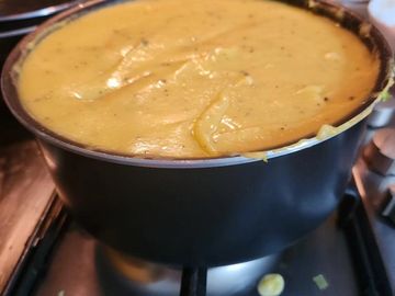 This delicious soup, has potatoes, leek, garlic, and Kos. We make a large pot, about 2 kg (~4lbs) and our kids eat the majority of it with no leftovers. I enjoy it with a piece of bread that has happy cow cheese on it.