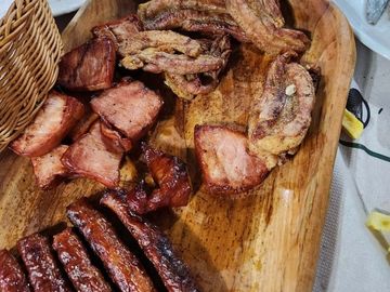 The meats are grilled over an open flame; the kids eat all of the sausage so if you want one you have to snag it quick. The ham is my favorite; the ribs are on a bone. They are pork ribs.