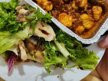 This salad was nice and fresh, and I enjoy eating it with the Gnocci Ragu. This is arugula, lettuce, red cabbage, avocado, chicken, cheese, olive oil, and balsamic vinegar.