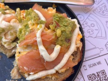 This breakfast item was delicious. It was scrambled eggs, smooshed avocado, smoked salmon, topped with cream cheese. My husband was very upset because our son ate the majority of it, and he said that he did not get enough as it was so yummy.